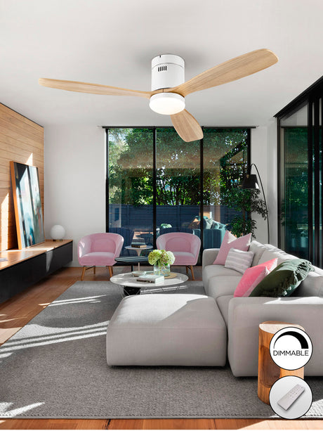 Ventilador de techo con luz Faro Mini motor DC LED arce 2700-6000K CCT Ø90cm 3 palas 33821-1TW