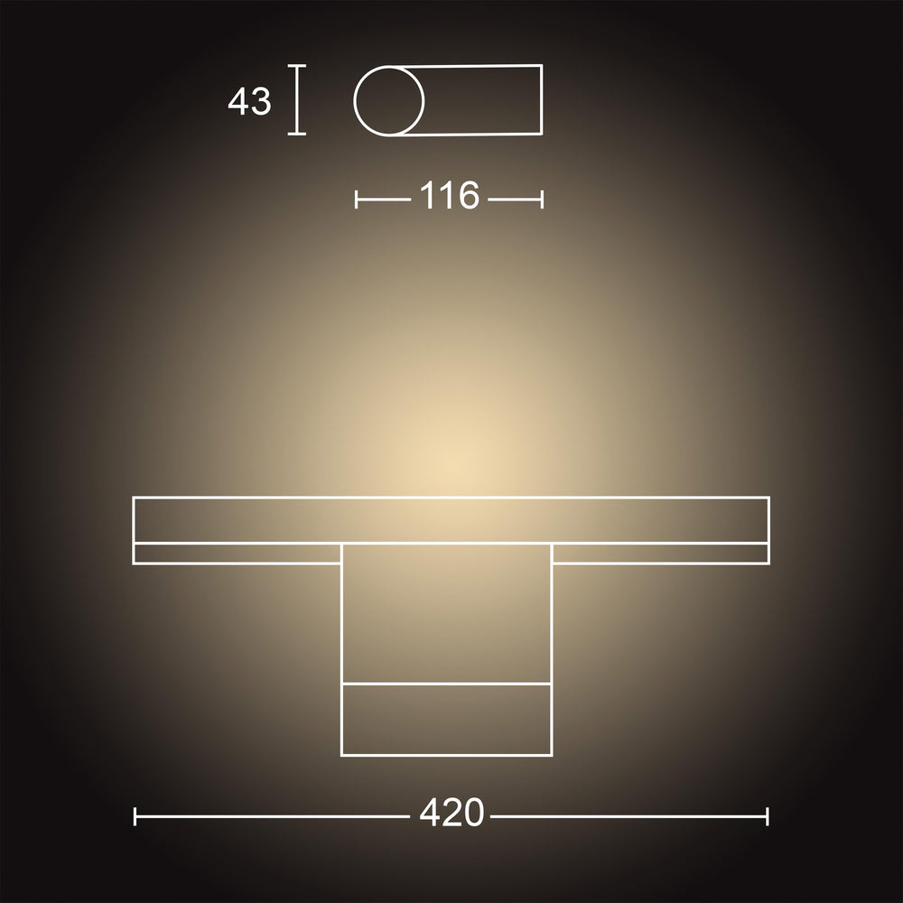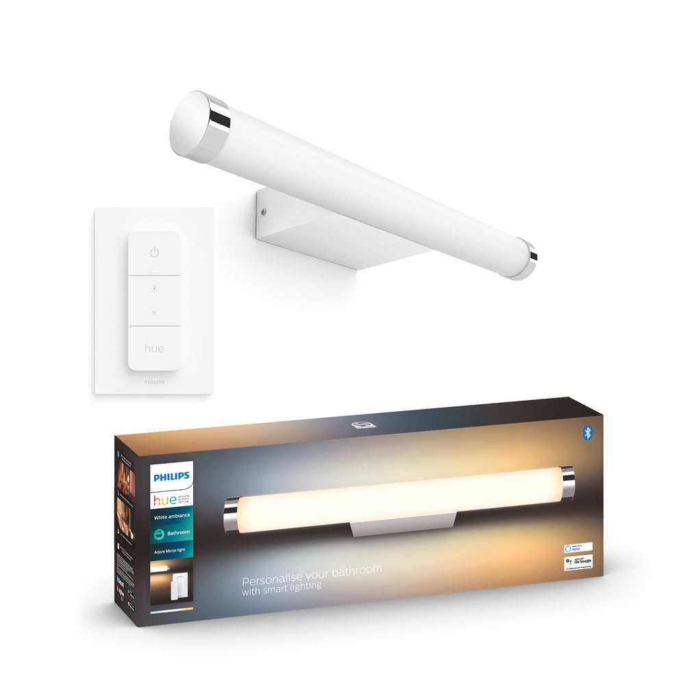 El aplique mural Philips Hue White Ambiance Adore combina un diseño clásico con funcionalidades modernas. Las fórmulas de iluminación te permiten leer, relajarte, llenarte de energía y concentrarte con el Hue dimmer switch incluido o la aplicación Bluetooth para disfrutar de un control instantáneo. Añade un Philips Hue Bridge para descubrir más características. Coloca la luminaria en horizontal sobre el espejo o instala dos en vertical a ambos lados para crear un ambiente insuperable.