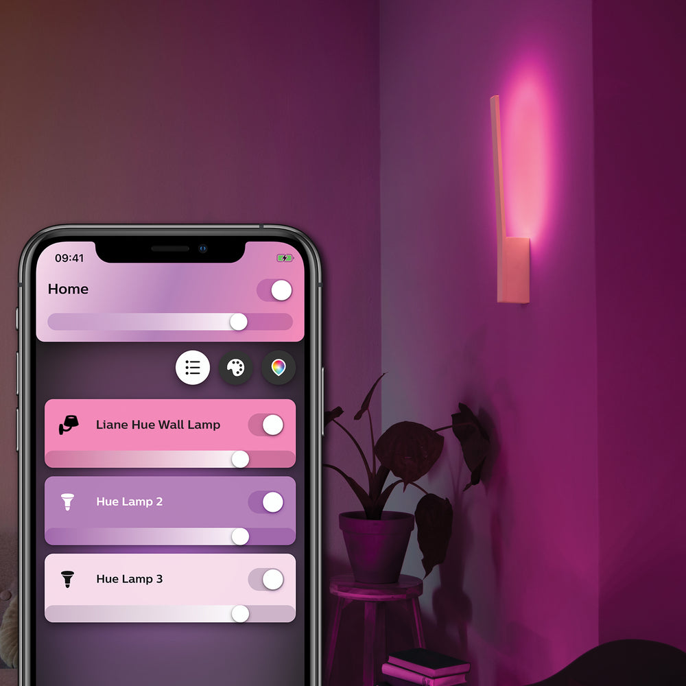 El aplique mural Liane tiene un elegante diseño y un efecto de iluminación indirecta. Crea la atmósfera perfecta con cualquier tonalidad de blanco o con luz de color. Funciona como una lámpara independiente o como parte de tu sistema de iluminación inteligente con Hue Bridge.