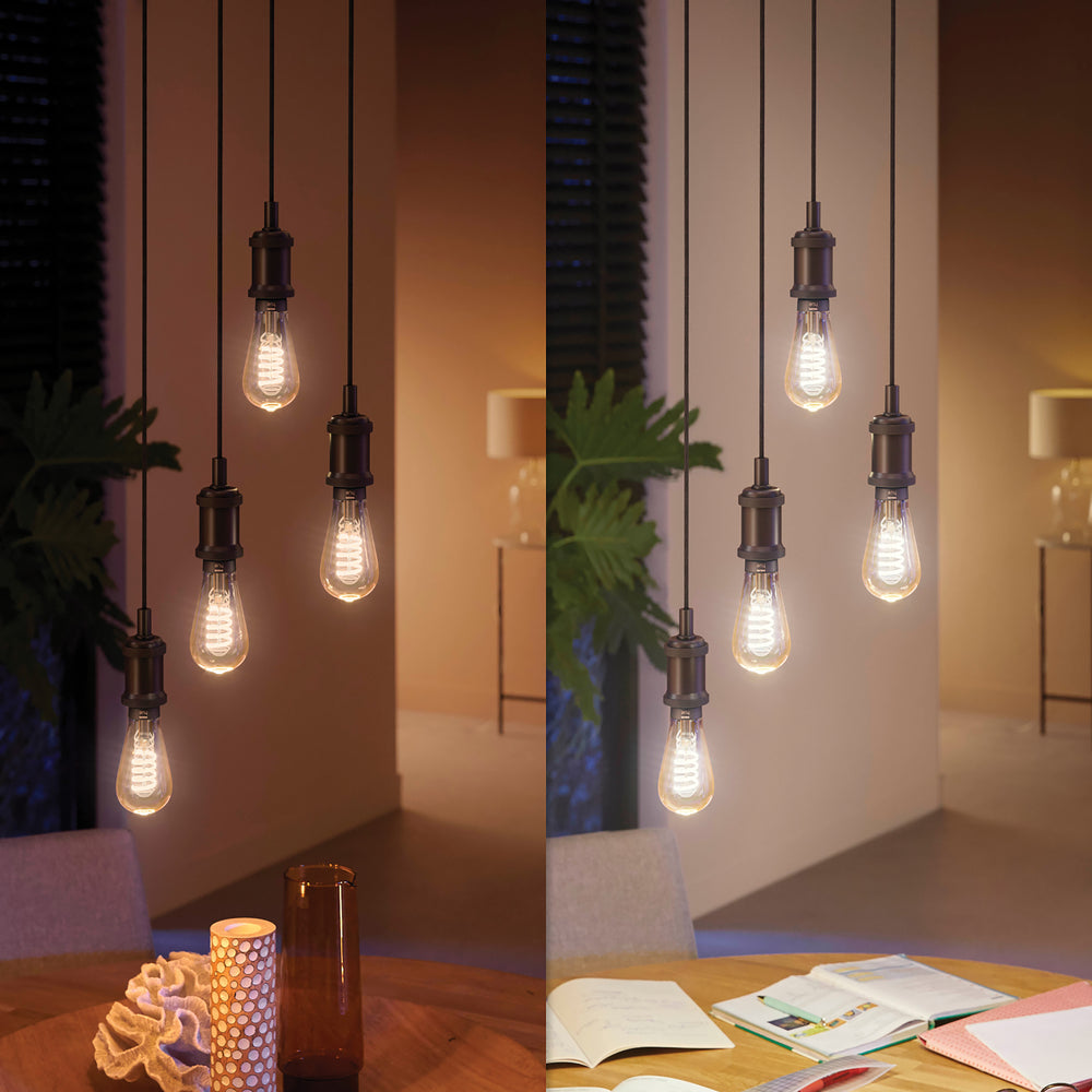 Consigue una luz blanca cálida a fría con la bombilla ST72. Con una base E27, filamento interior en espiral, regulación instantánea y todas las características de la luz inteligente, esta bombilla LED combina lo antiguo y lo nuevo.
