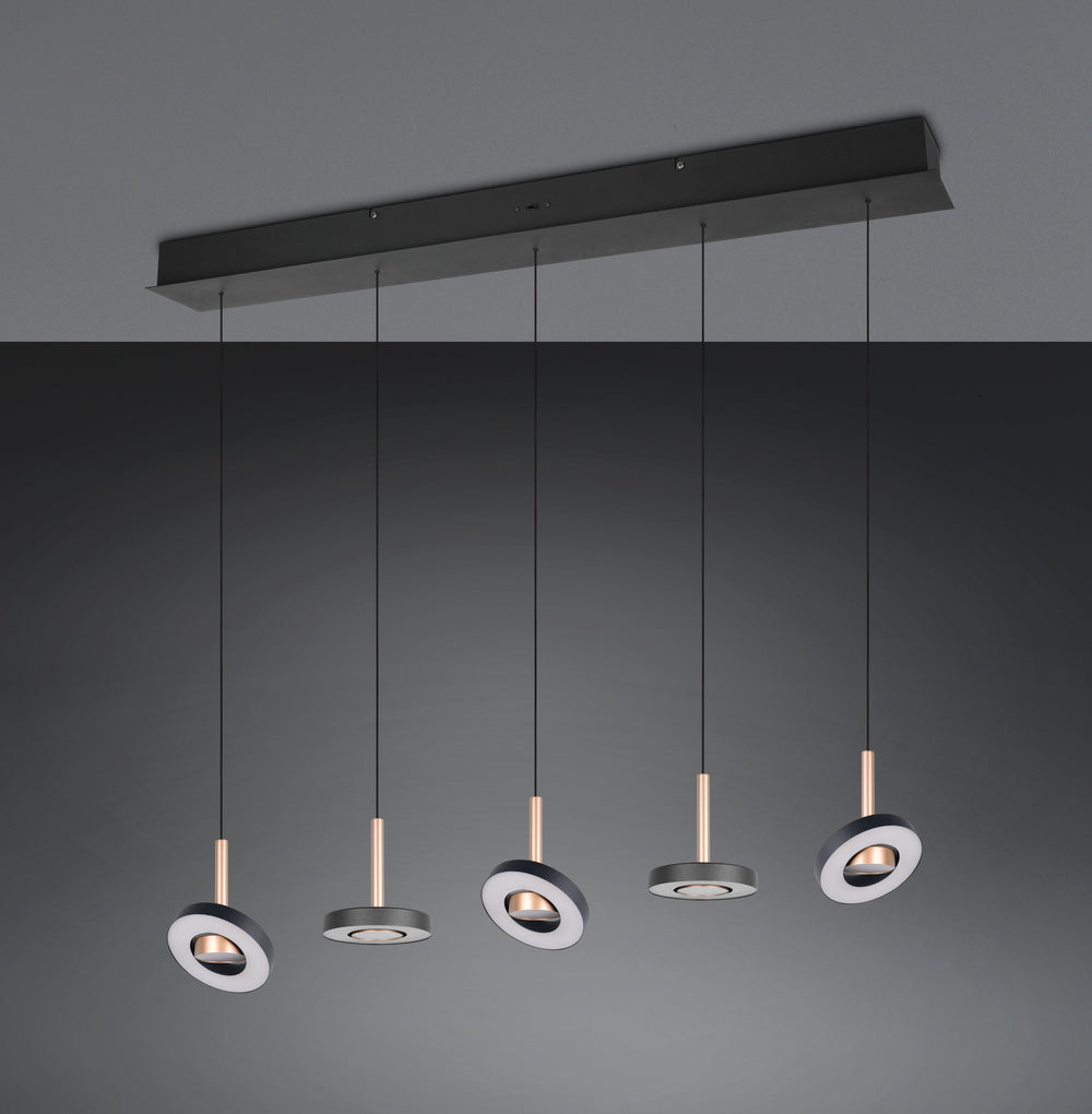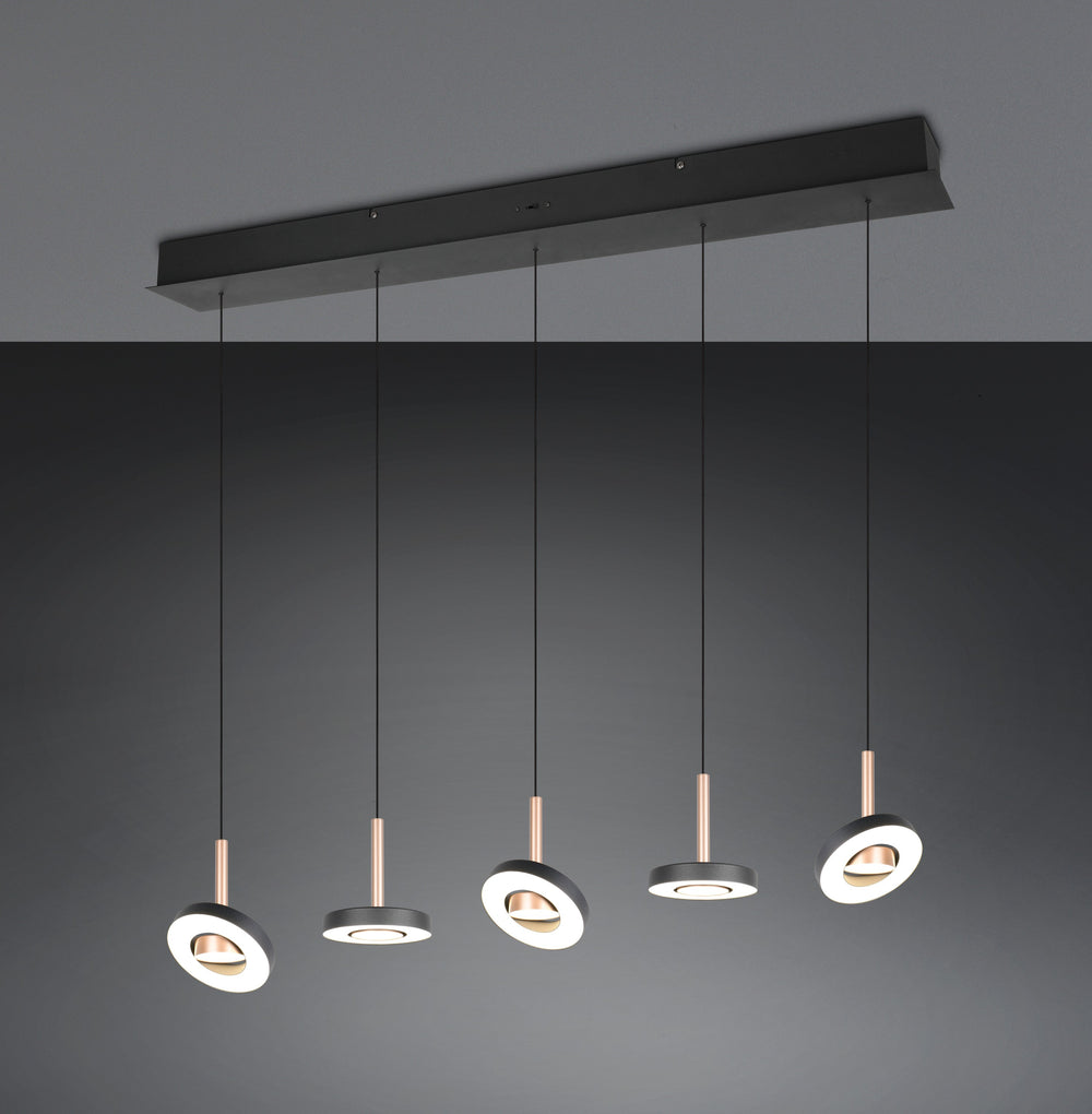 Ilumina con precisión y calidez con la lámpara colgante Trio Guano de 5 luces en coffee, una luminaria que combina diseño lineal, control total de la luz y acabado contemporáneo en tonos cálidos.