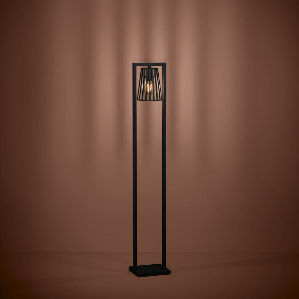 La lámpara de pie Bogota 390006 de EGLO combina acero con acabado negro. La lámpara de pie BOGOTA está formada por un marco rectangular de metal negro combinado con una pantalla cónica con varillas de hierro planas. La bombilla visible en el medio de la pantalla completa el interesante diseño de la lámpara. Además, la pantalla de metal crea un fascinante juego de luces y sombras. Se puede utilizar un interruptor de pie en el cable para encenderla y apagarla cómodamente. La lámpara de pie encaja en estilos modernos e industriales y proporciona una iluminación elegante en el salón, el dormitorio o el comedor. La bombilla de filamentos que se muestra no está incluida. La lámpara es apta para cualquier bombilla con casquillo E27.