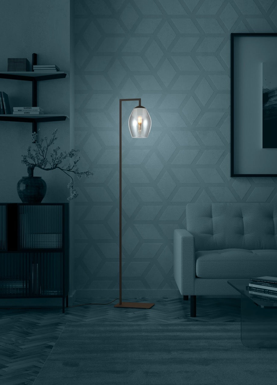 La lámpara de pie Estanys 390256 de EGLO combina acero / vidrio vaporizado con acabado negro / negro transparente. La lámpara de pie ESTANYS 1 está fabricada con una base negra y una pantalla de vidrio ahumado en negro transparente (fumé). Se puede encender y apagar cómodamente mediante un interruptor de pie en el cable. La lámpara de pie de diseño minimalista ofrece una iluminación acogedora en el salón, dormitorio o comedor. La bombilla de filamento que aparece en la imagen no está incluida. La lámpara es adecuada para cualquier bombilla con casquillo E27.
