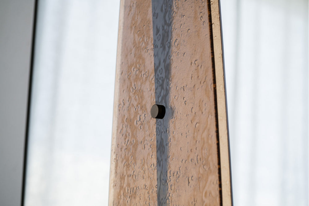 - Diseño escultórico: compuesto por dos espejos de forma ovalada dispuestos en vertical y una pieza central de vidrio texturizado en color ámbar. su disposición genera un juego visual de reflejos y transparencias que aporta profundidad y dinamismo.