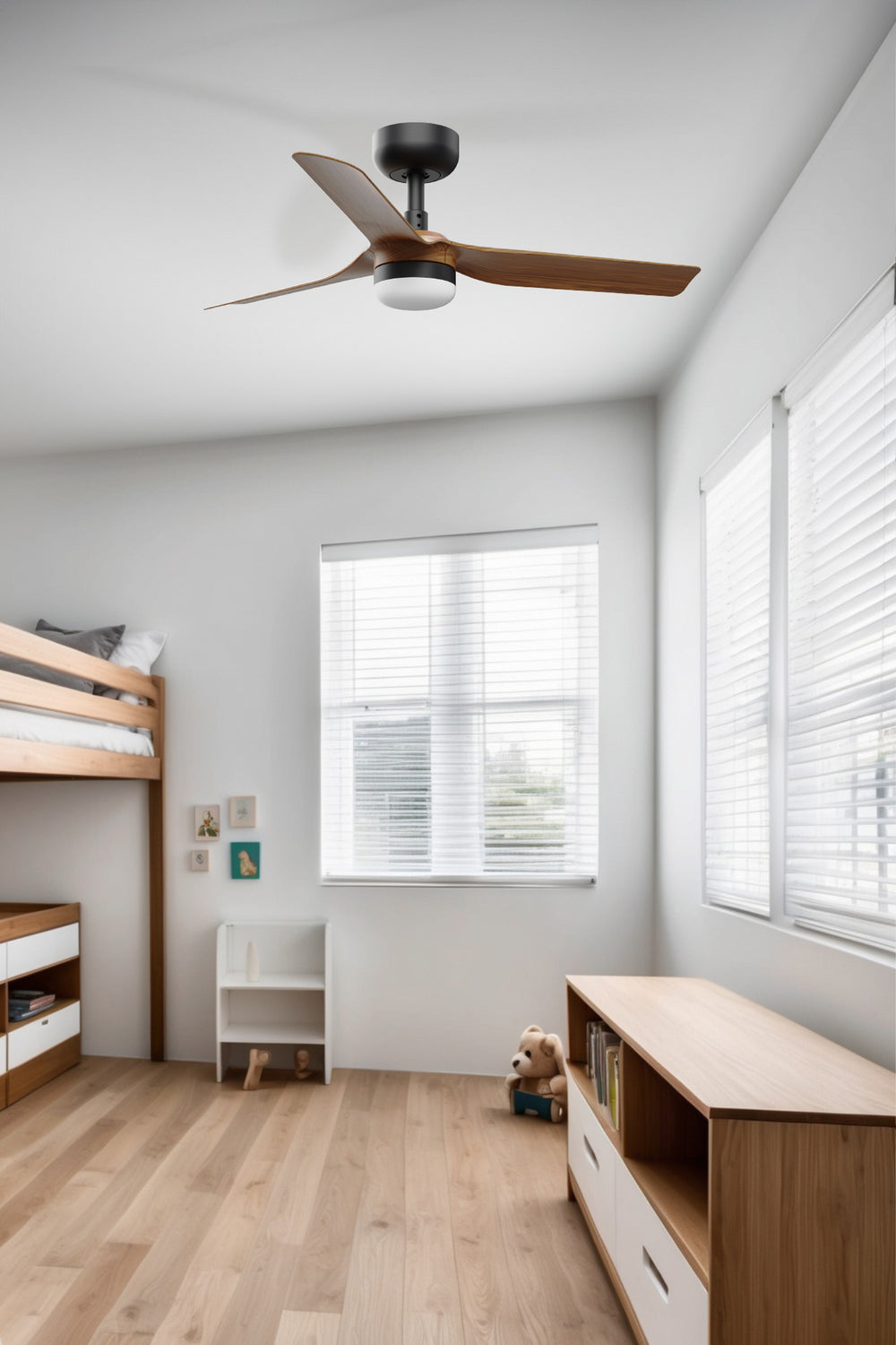MINI PUNT es un ventilador de techo de diseño moderno y minimalista. Versión negro con 3 palas en acabado madera oscura y kit de luz LED 10W. Sistema Smart Tuya integrado.