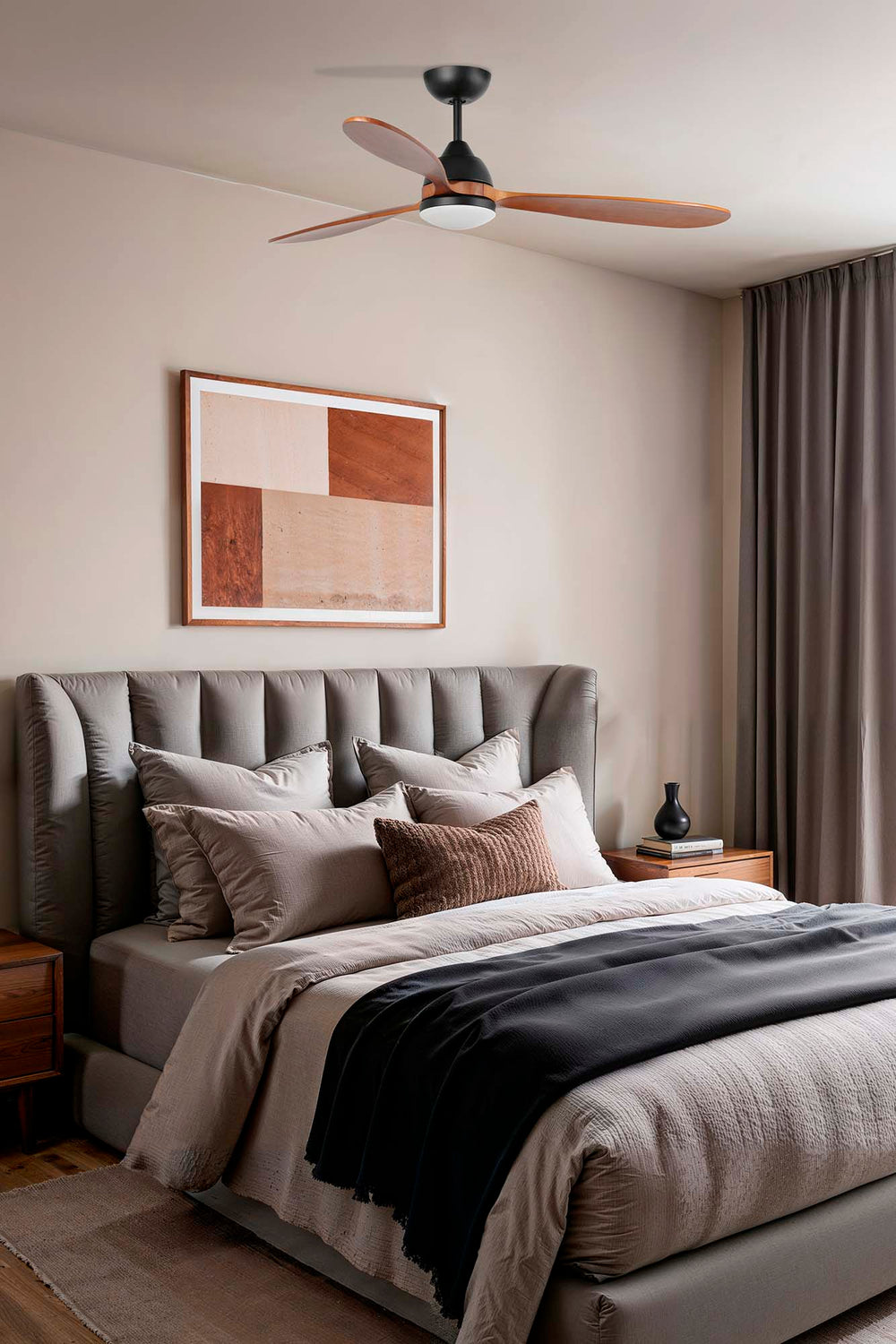 POROS es un ventilador de techo con luz y acabado en negro y nogal y palas redondeadas.