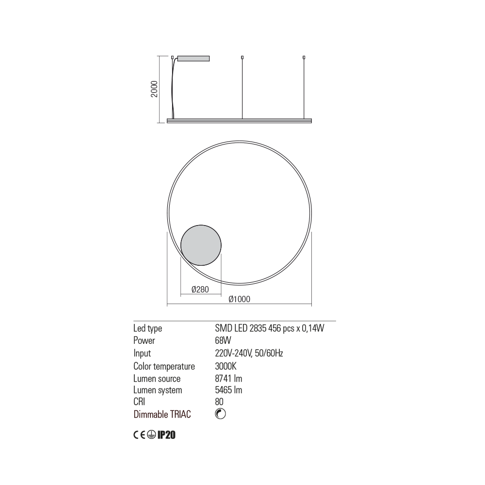 Diseño imponente: su diámetro de Ø 1000 mm convierte esta lámpara en un elemento protagonista en salones amplios, zonas diáfanas, vestíbulos y espacios corporativos.