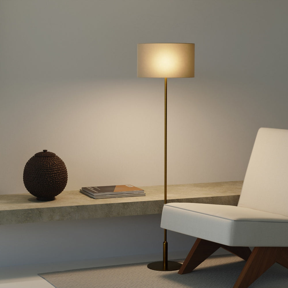Lámpara de pie de salón BASIC STYLO en acabado latón satinado con pantalla textil natural. Atemporal y funcional y elegante. Funciona con bombilla E27.