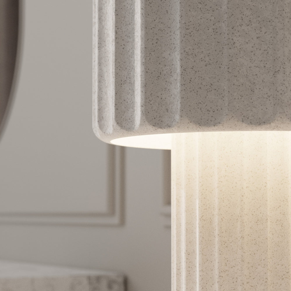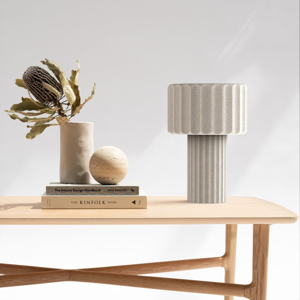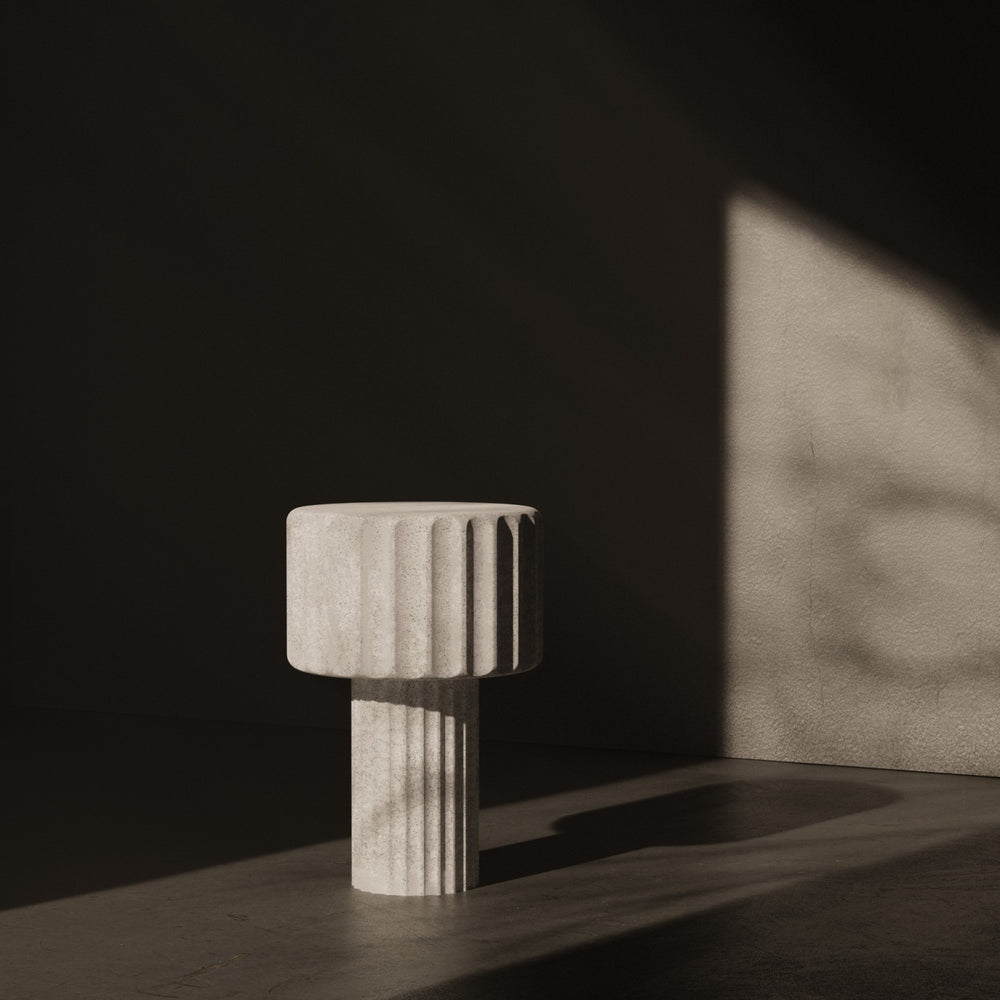 OLIMPIA es una lámpara de sobremesa de hormigón blanco. Pieza escultórica imponente y atemporal con luz ambiental serena. Con botón táctil y 2 bombillas E27.