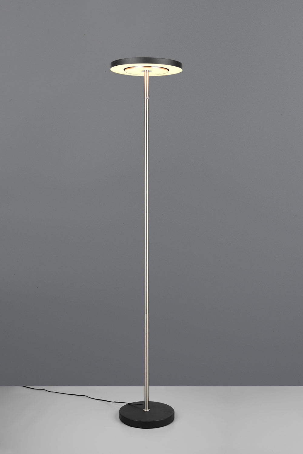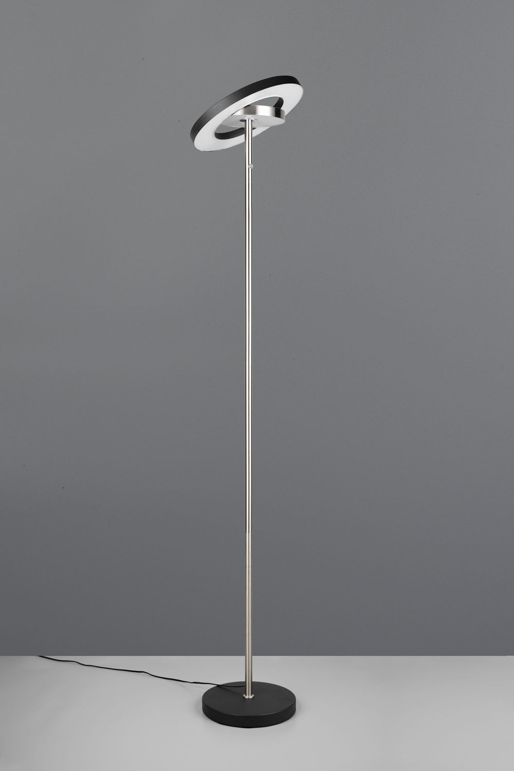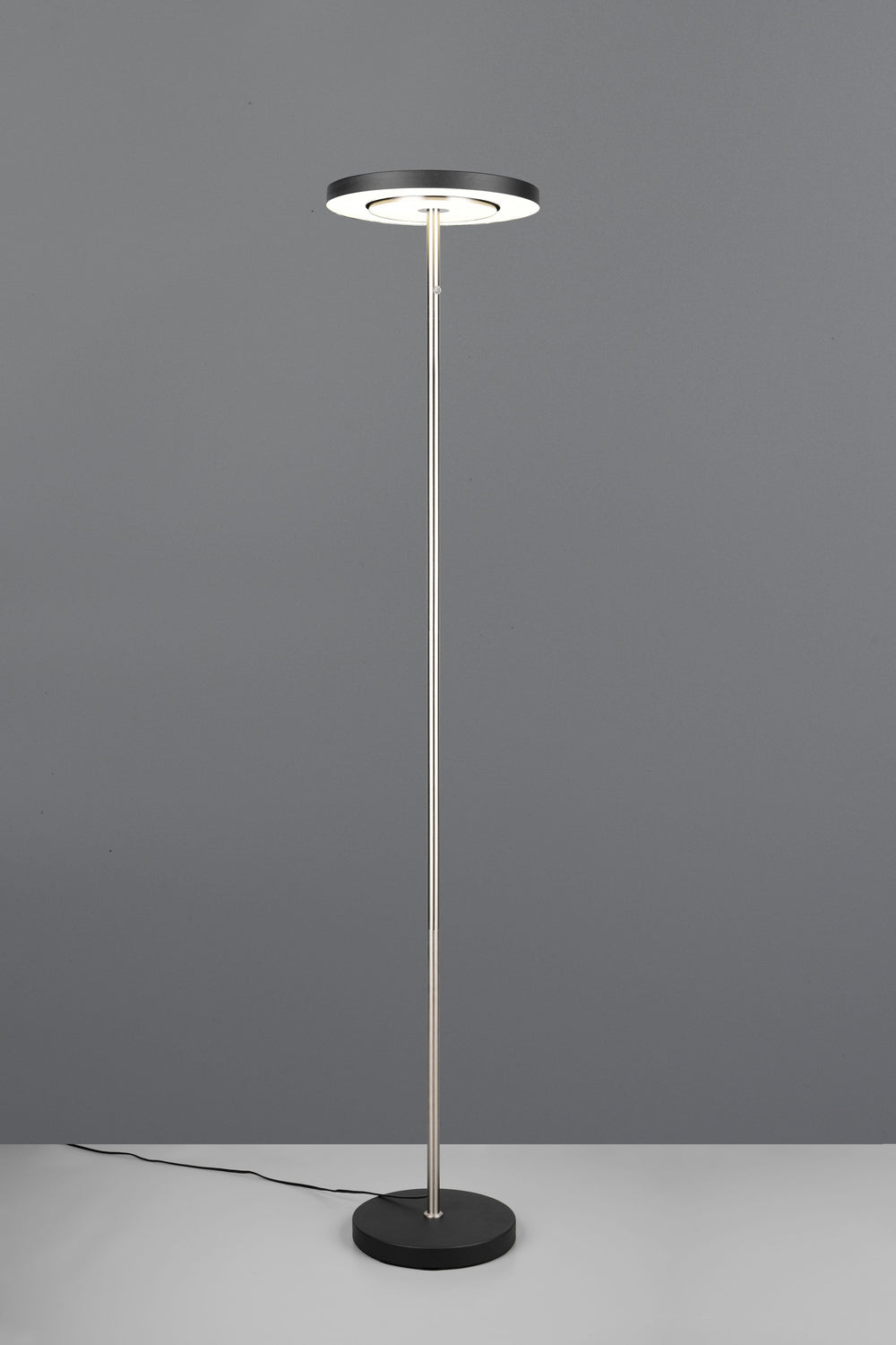 Ilumina con elegancia con la lámpara de pie Trio Guano en níquel mate, una luminaria que combina diseño contemporáneo y tecnología LED.