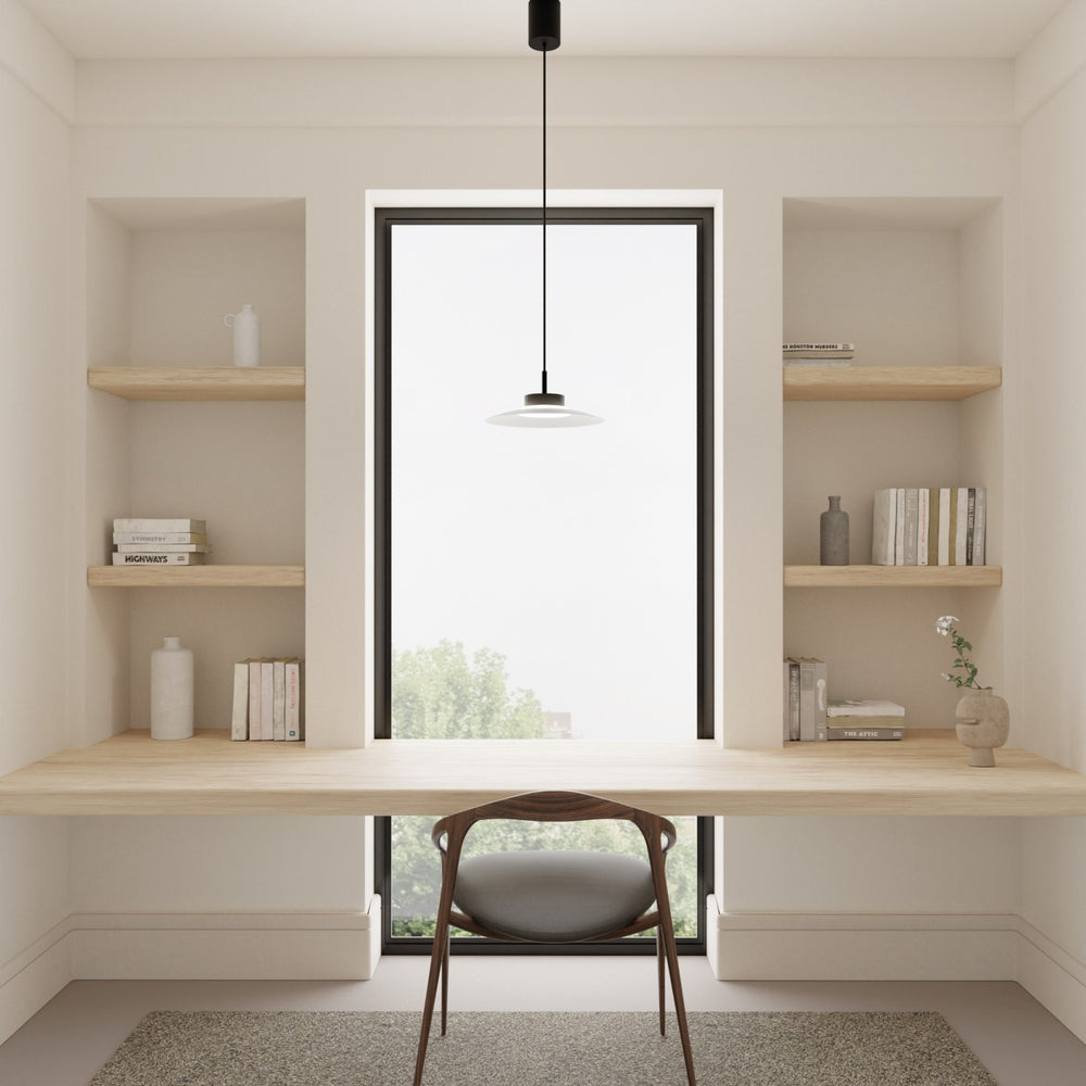 CARMEN es una lámpara de techo formada por pantalla en acabado blanco arenado (diámetro 30 cm) y módulo negro (LED 9W) con cable de nailon color negro. CCT