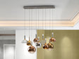 Elaborada con una estructura de aluminio cepillado con acabado gris oscuro, esta luminaria ofrece un soporte sofisticado para sus nueve puntos de luz. Las tulipas incorporan un baño electrolítico en cuatro elegantes tonalidades (cobre, dorado, plata y cristal transparente), permitiendo composiciones visuales dinámicas y personalizables que se adaptan a diferentes estéticas decorativas.