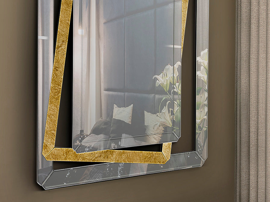 El fondo en pan de oro del marco aporta un brillo cálido y sofisticado que realza la belleza del espejo. Esta técnica artesanal tradicional confiere a la pieza un carácter exclusivo y distinguido, perfecto para espacios que buscan elegancia y distinción.