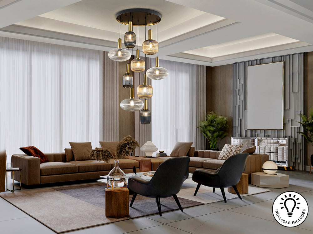 Discover the elegance and sophistication of a 9-light lamp, crafted with meticulous attention to detail. The metal's elegant matte black finish blends perfectly with the satin brass accents, creating a captivating and modern visual contrast.
