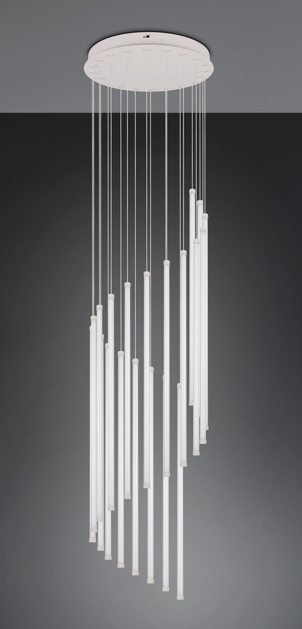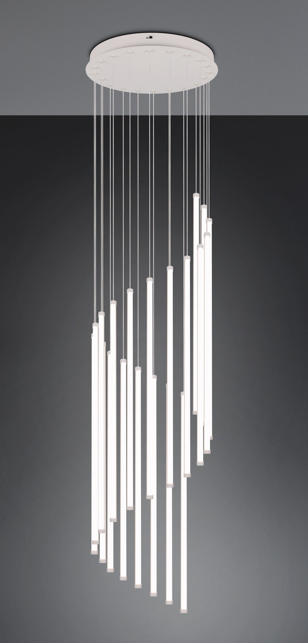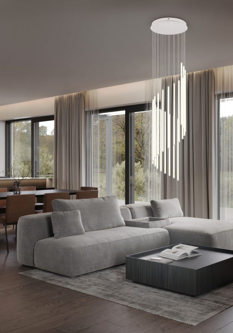 Transforma espacios amplios con la lámpara colgante Trio Baxter de 20 luces en gris cálido, una luminaria arquitectónica que combina potencia luminosa excepcional, diseño escultórico y calidez contemporánea.
