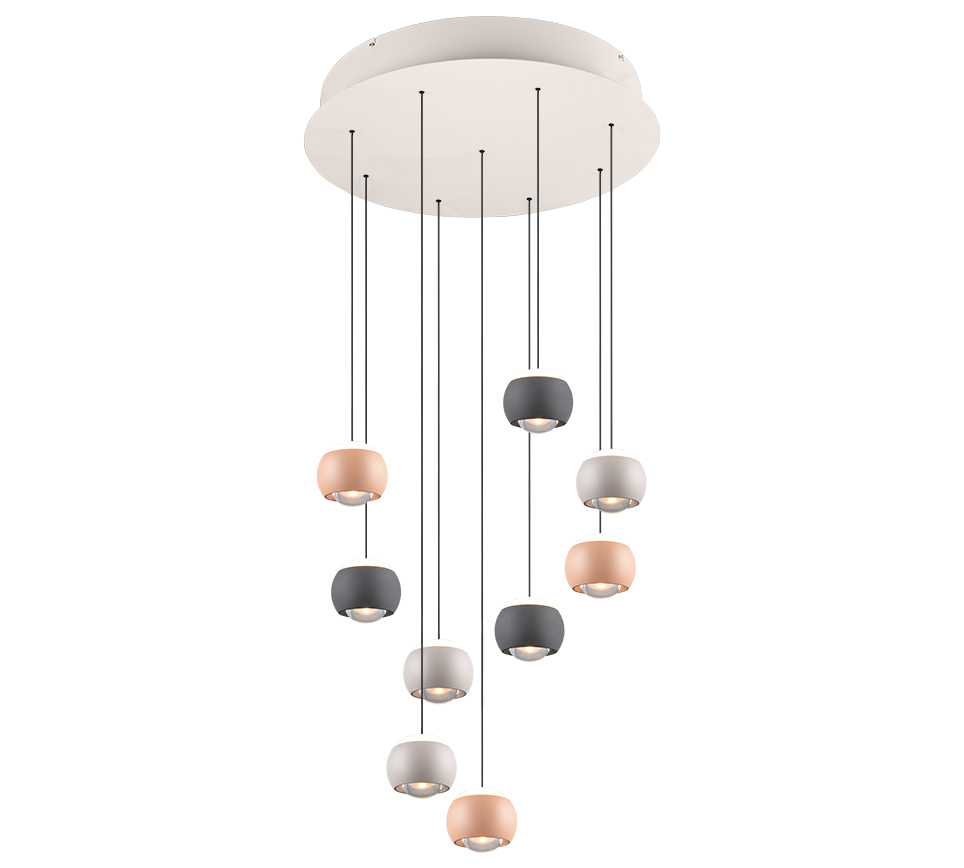 La lámpara colgante Trio Cannon en acabado multicolor es una pieza de iluminación que combina funcionalidad y expresión decorativa. Con sus 9 esferas de cristal en tonos negro, blanco y dorado rosa, esta luminaria crea un punto focal vibrante y contemporáneo, perfecto para espacios que buscan carácter y distinción.