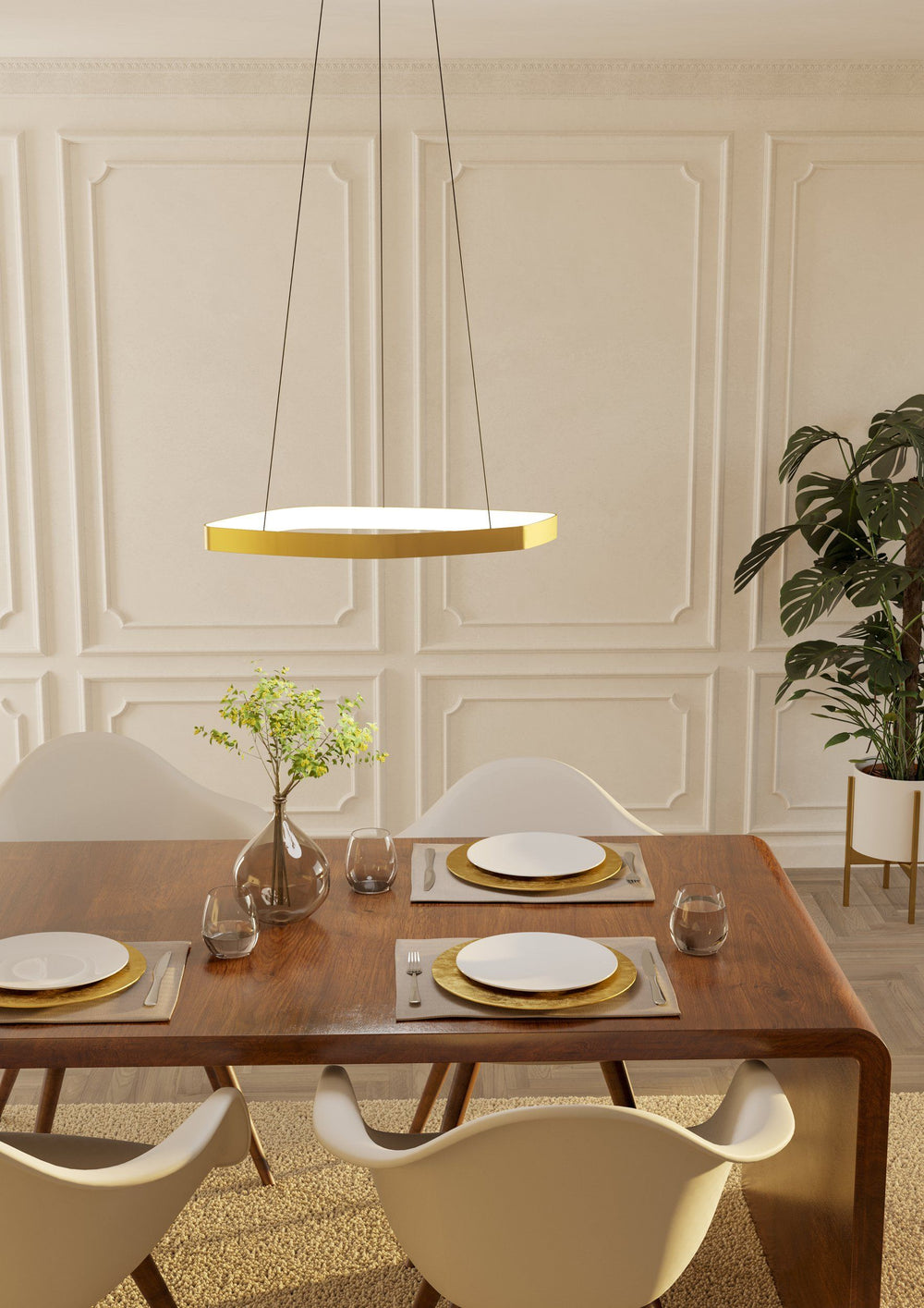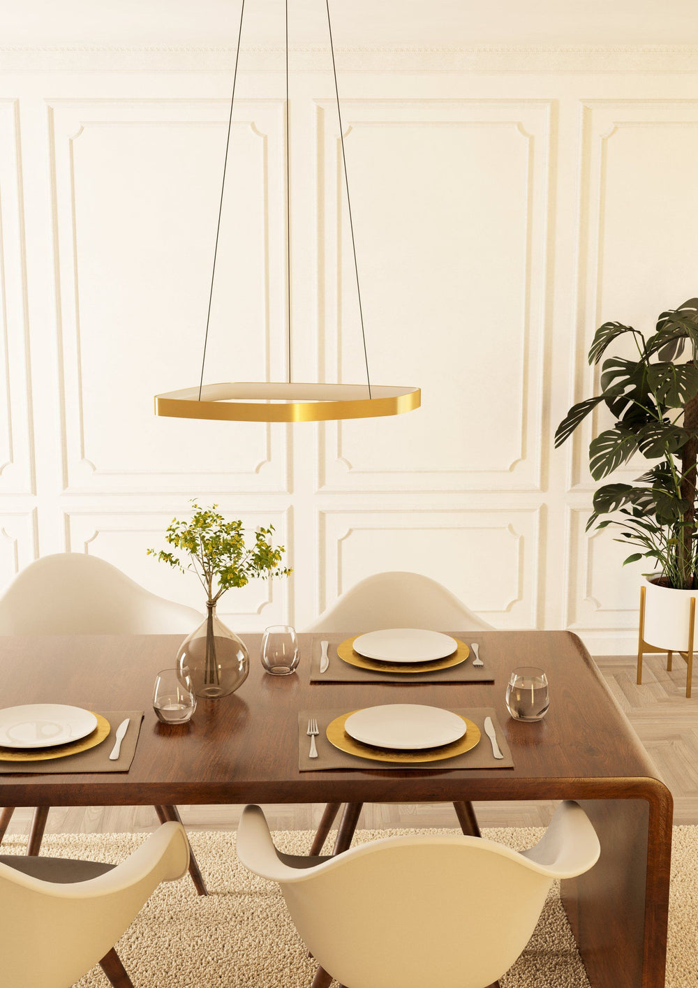 Esta lámpara colgante es perfecta para salones y comedores donde se busca iluminación principal con presencia decorativa. Su acabado dorado y gran tamaño la hacen especialmente adecuada para mesas de comedor, zonas de estar o como iluminación central en espacios que buscan toques de glamour contemporáneo.