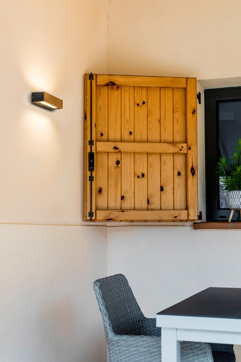 Aplique de exterior Faro Doro LED teca 3000K IP65 95° prismático 22cm 71899