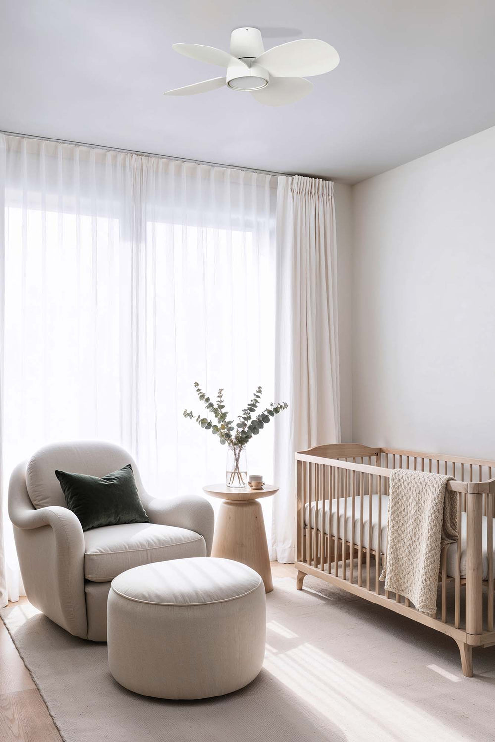 KLOVER de Faro Lab es un ventilador de techo blanco con luz moderno pequeño.