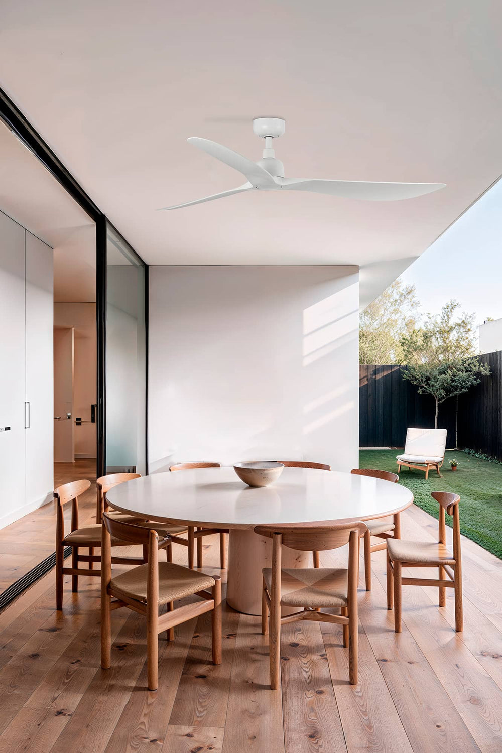 OUTWOOD es un ventilador de techo blanco diseñado por Faro Lab apto para exteriores. Sus palas de ABS y acabado en blanco están protegidos contra rayos UV, evitando su deterioro y decoloración.