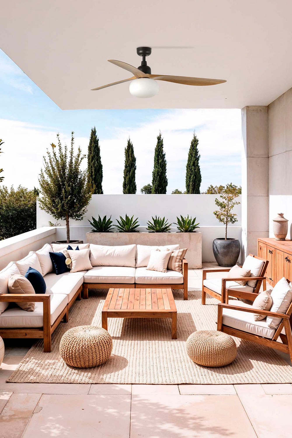 Outwood es un ventilador de techo de superficie en acabado de palas roble, de tamaño L. Equipado con un motor DC, ofrece 6 velocidades regulables, dispone de función inversa y es apto para techos inclinados.
