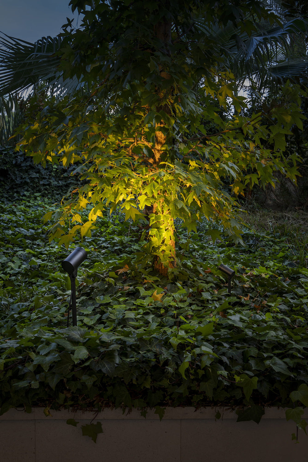SAU 620 es un proyector/estaca GU10 de color negro para exterior con diseño moderno y estilizado, fabricada en aluminio y difusor de PMMA. Incluye accesorio opcional que permite su instalación como estaca. Con protección IP65, es ideal para iluminación decorativa en jardines, destacando elementos como plantas, árboles u objetos.