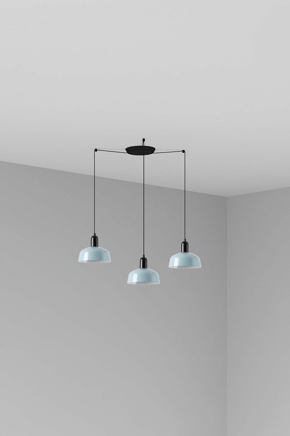 TATAWIN es una lámpara colgante con estructura negra que tiene un diseño clásico y atemporal, gracias a una pantalla metálica azul grisáceo que ofrece una luz focal.