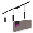 Este kit de iluminación con carril de techo en negro incluye tres lámparas colgantes, un carril de 1 metro, un carril de 0,5 metros y una fuente de alimentación que se coloca entre los dos carriles.