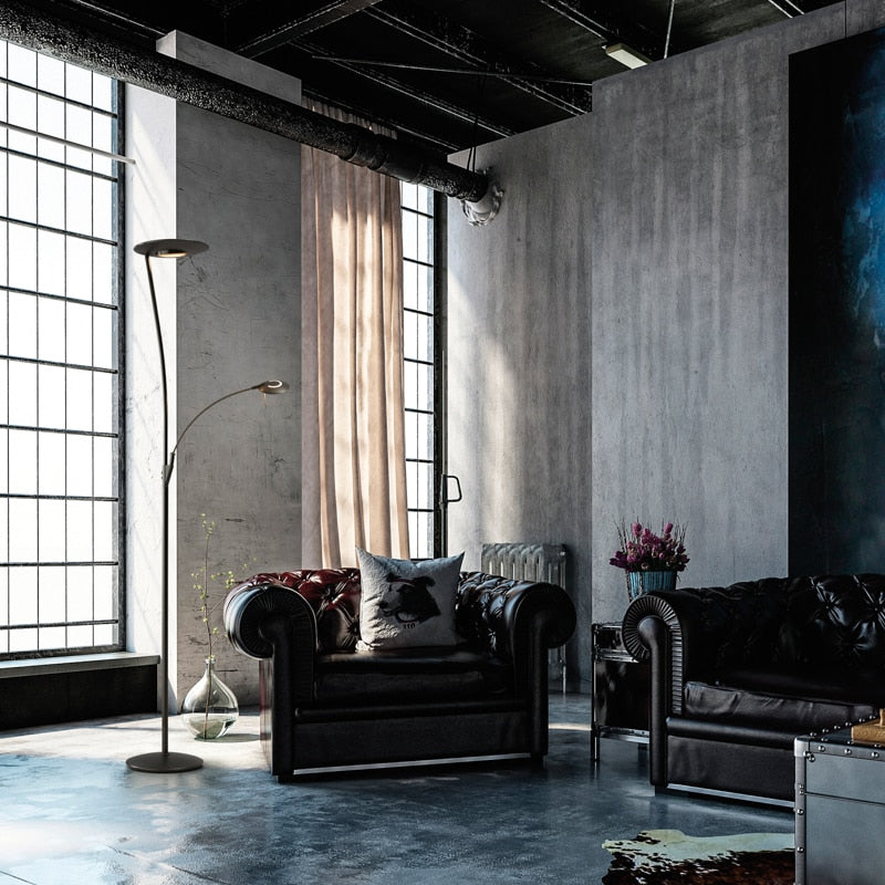 Pie de suelo LED, modelo ZENIT con brazo de lectura LED regulable y la luz de ambiente también es regulable su encendido. Gran potencia de luz, sobre todo amplia comodidad y elegancia.