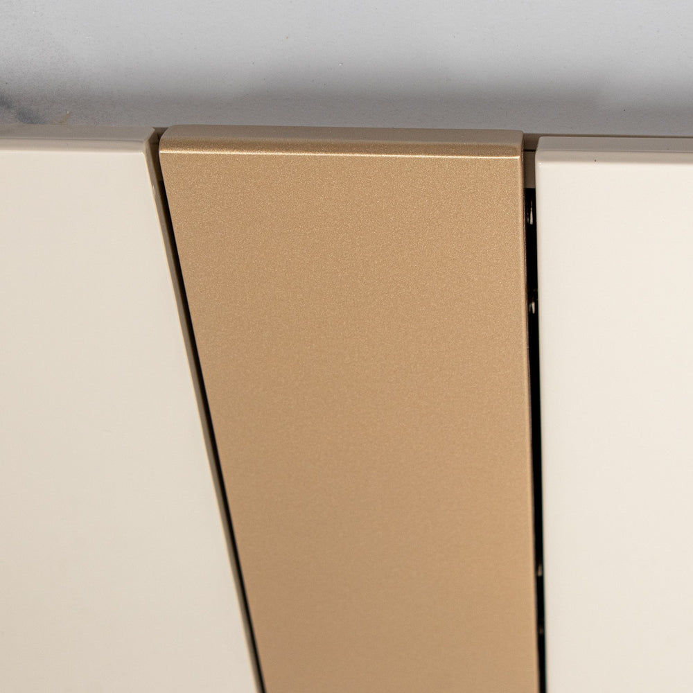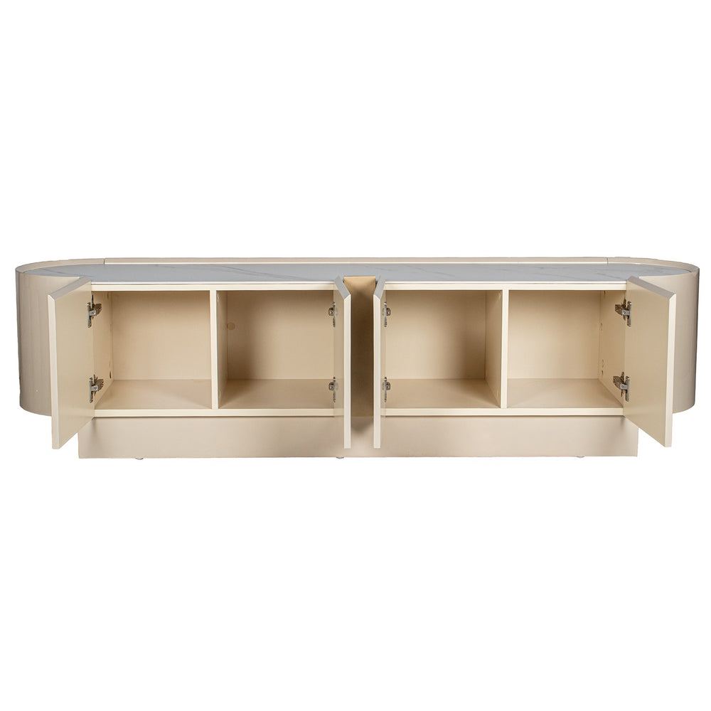 Este elegante mueble de TV se distingue por su sofisticada combinación de madera beige y una tapa de mármol blanco con vetas grises, complementado con un detalle de herrajes dorados en el centro de las puertas, que aporta un toque de lujo al diseño. Con un formato amplio, cuenta con cuatro puertas que proporcionan un espacio de almacenamiento adecuado para equipos electrónicos, accesorios o decoraciones, mientras que su diseño limpio y moderno le otorga versatilidad para integrarse en distintos estilos de decoración.