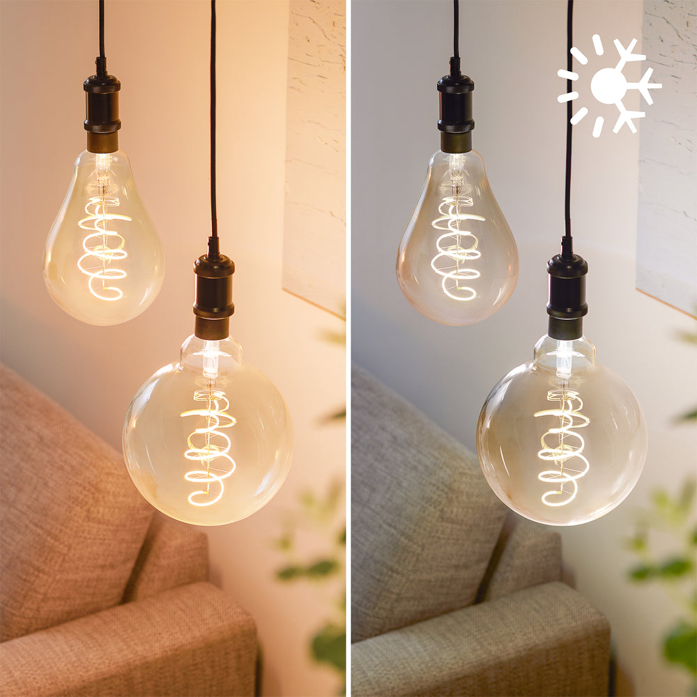 Pon una nota decorativa en cualquier habitación con el brillo ámbar de una bombilla de filamento Philips Smart LED con forma de globo de gran tamaño, que ofrece luz blanca cálida o fría. Esta bombilla se conecta a WiZ. Úsala con tu wifi para controlarla con la aplicación WiZ o con tu propia voz.