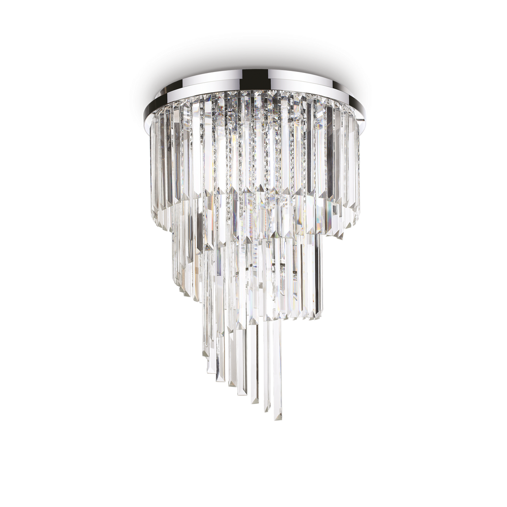 El plafón de techo Carlton de Ideal Lux en acabado cromo, fabricada en metal, cristal, cerámica, combina el diseño italiano contemporáneo con prestaciones excepcionales.