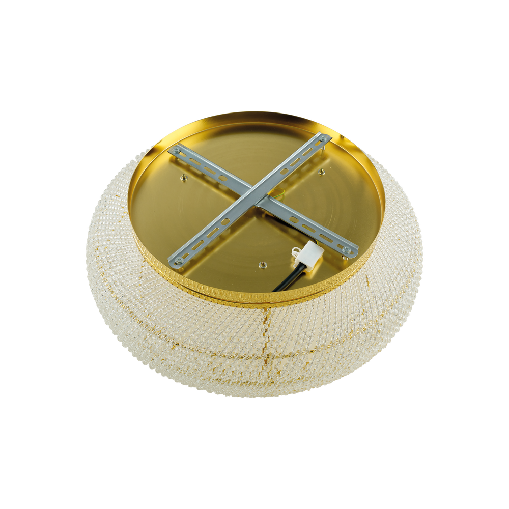 El plafón de techo Pasha' de Ideal Lux en acabado dorado, fabricada en metal, cristal, cerámica, combina el diseño italiano contemporáneo con prestaciones excepcionales.