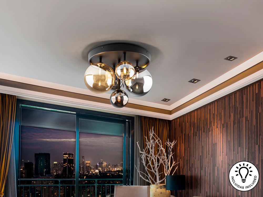 Plafón bolas Schuller Dark 5 luces negro y latón Ø45cm 439244
