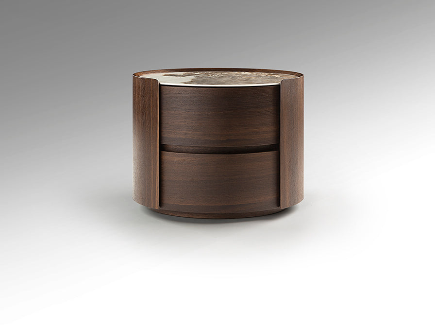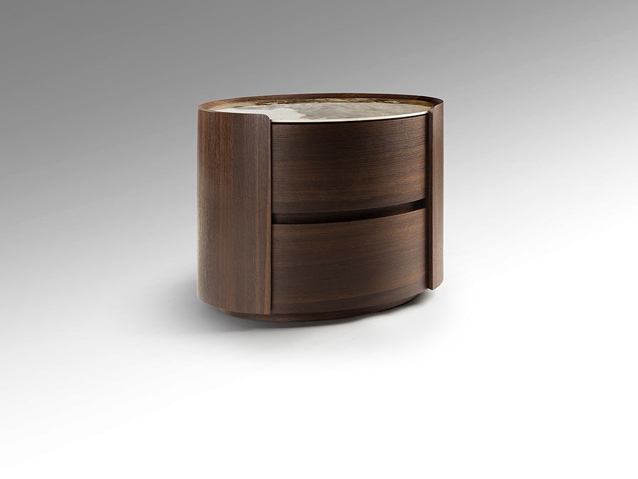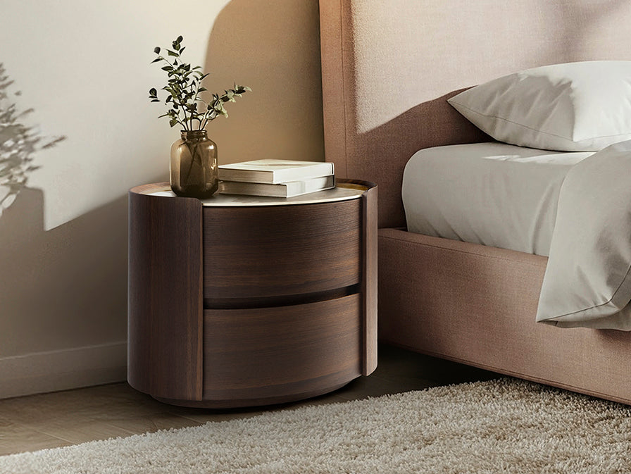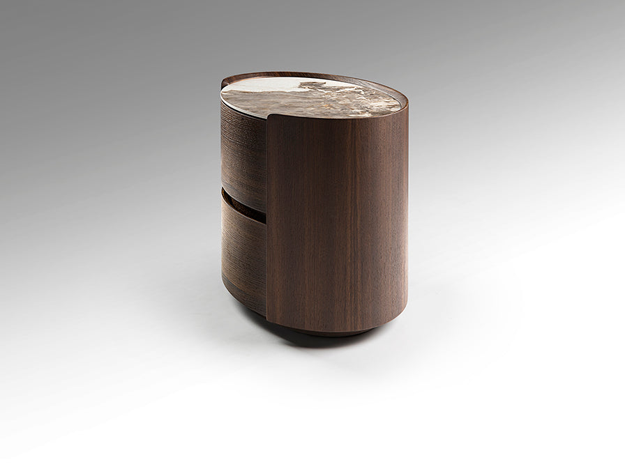 Esta mesita de noche es la elección ideal para quienes valoran el diseño ovalado orgánico, la combinación de madera y porcelánico y buscan una pieza de mobiliario que combine funcionalidad práctica, resistencia y alto valor estético junto a la cama.