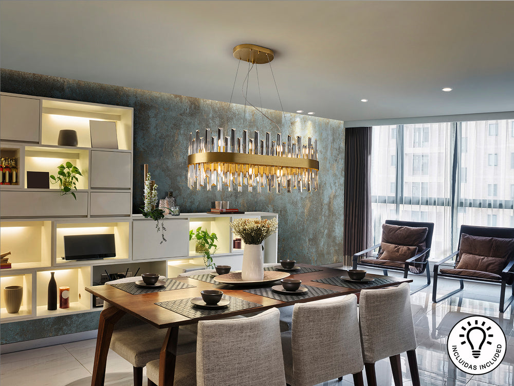 - Diseño ovalado y contemporáneo, perfecto para salones, comedores o vestíbulos con techos altos.