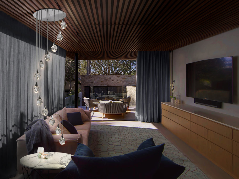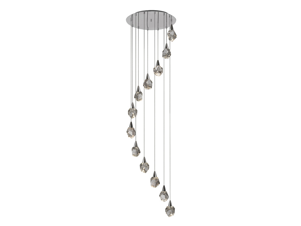 - Diseño escultural: Las 12 luces se distribuyen en una estructura de cromo brillante que realza el juego de luces y reflejos.
