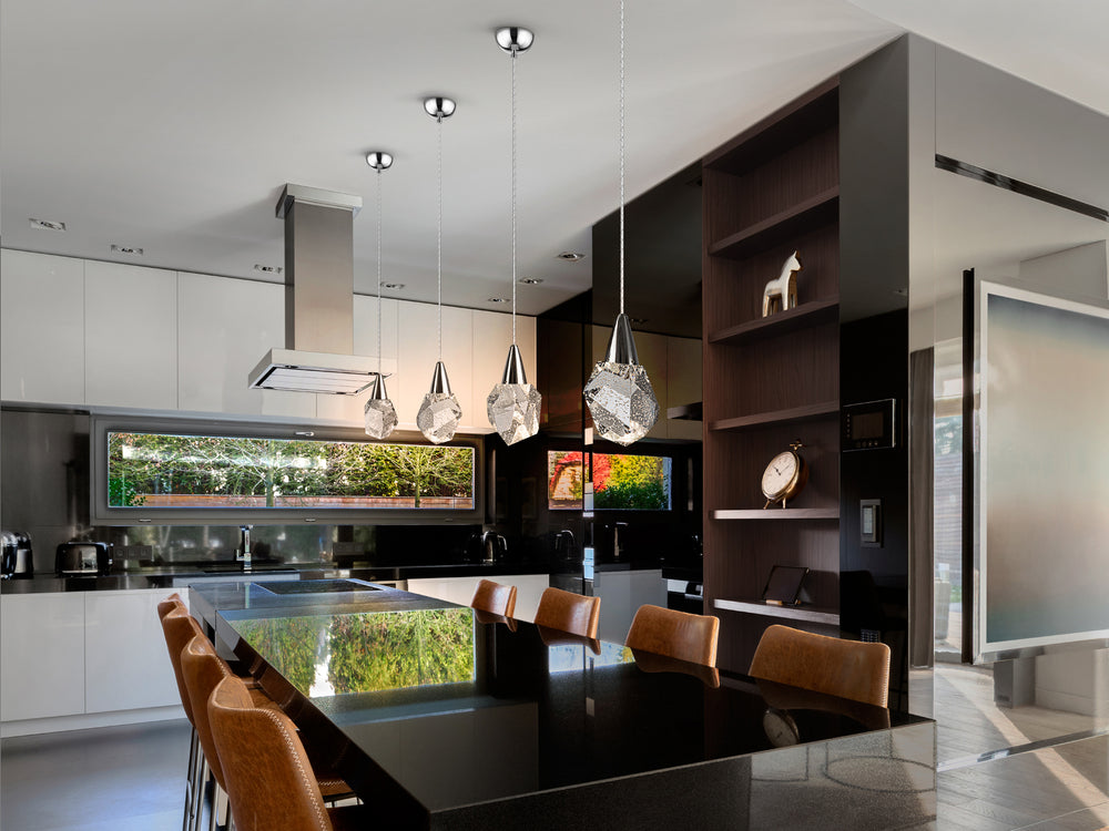 Realizada en metal con acabado cromo, esta luminaria de una luz LED se integra perfectamente sobre barras de cocina, islas, mesas de comedor o como elemento destacado en dormitorios. Su sistema de altura regulable permite adaptar la fuente de luz con precisión al espacio requerido.
