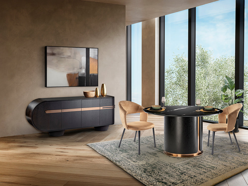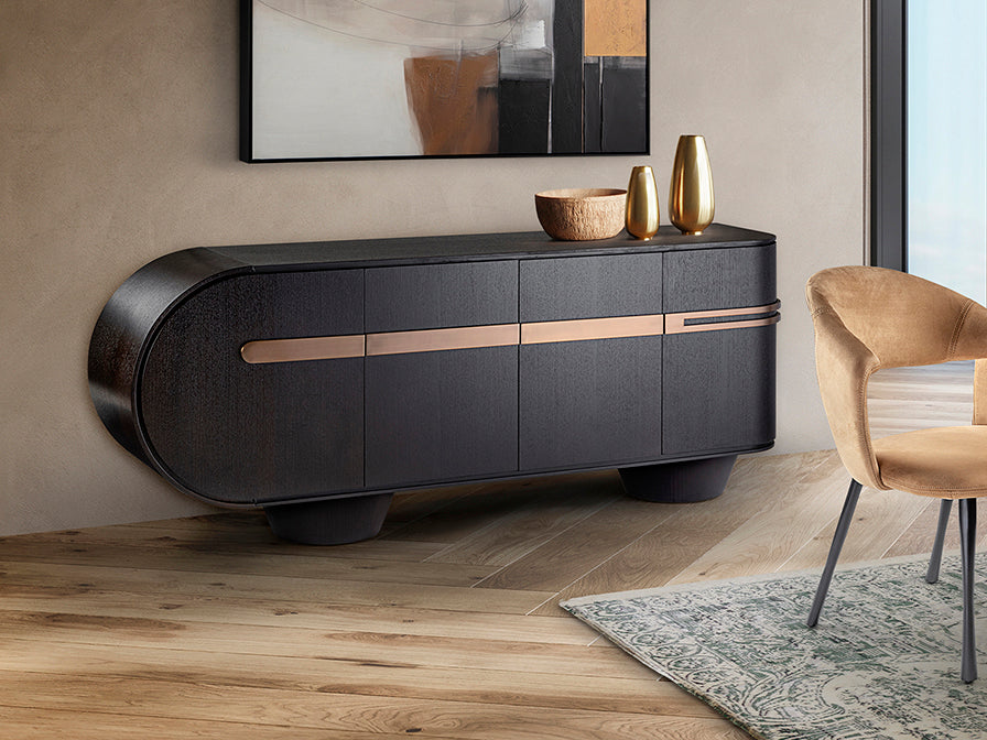 El aparador Luca de Schuller es una pieza de mobiliario contemporáneo que combina funcionalidad con diseño elegante. Su estructura en DM chapado en roble oscuro con herrajes y detalles metálicos en acero inoxidable oro rosa crea una pieza sofisticada que aporta calidez y distinción a comedores, salones o recibidores.