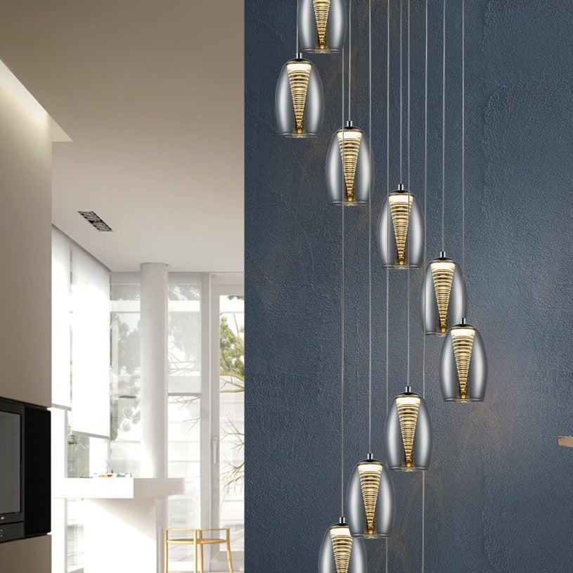 Este modelo se caracteriza por su doble tulipa, un detalle técnico que maximiza el impacto visual y la calidad lumínica. La capa exterior de cristal espejado ofrece un acabado de alto brillo que refleja el entorno con elegancia, mientras que la tulipa interior de policarbonato transparente, con su forma de cono escalonado, asegura una difusión de luz suave y uniforme, creando atmósferas cálidas y acogedoras.
