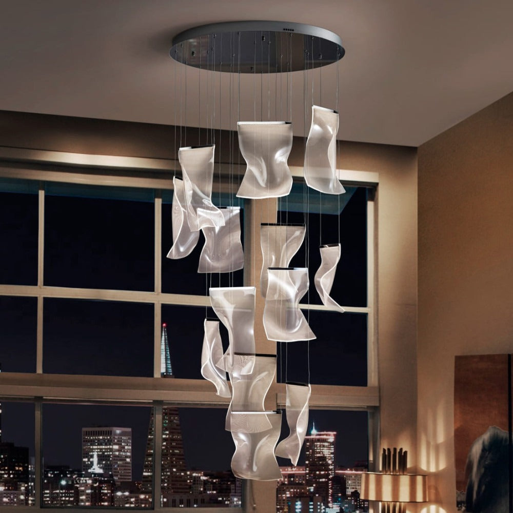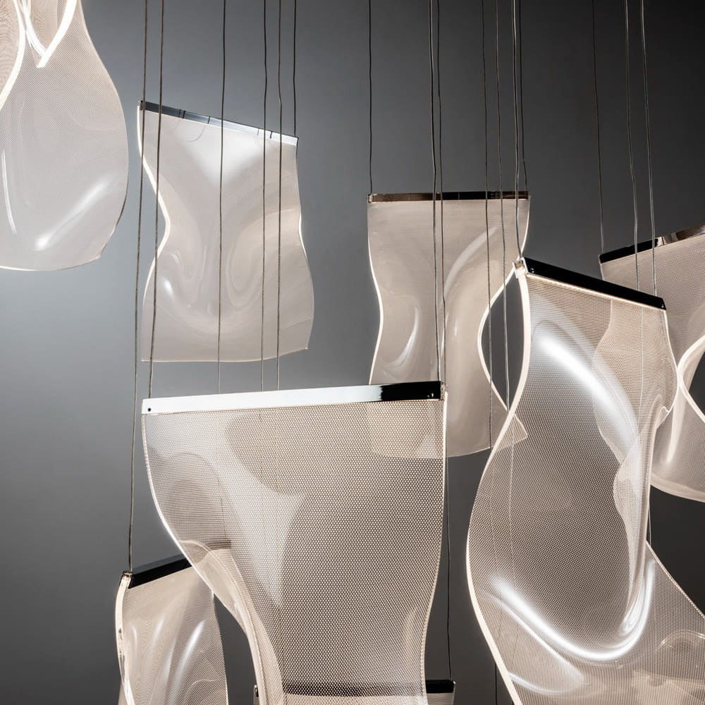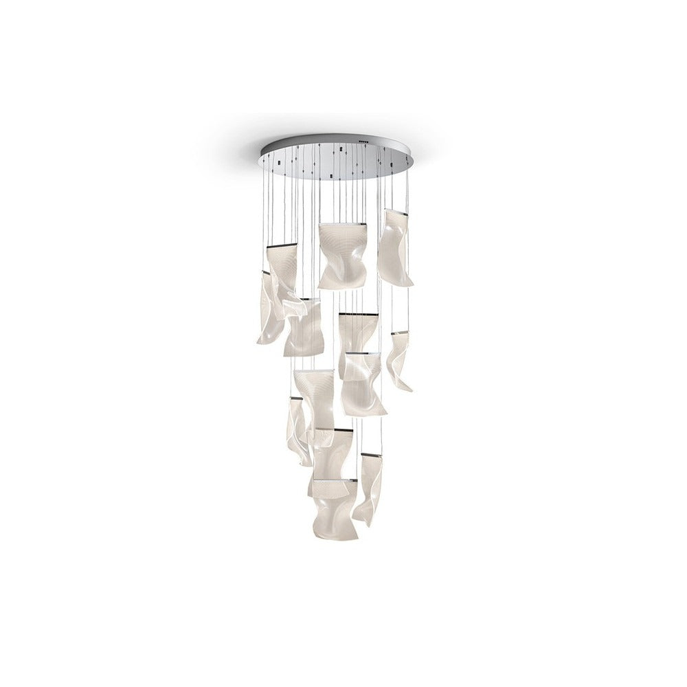 La lámpara Velos II destaca por su composición de 13 brazos que se extienden desde un punto central, creando una estructura radial que funciona como pieza escultórica. Este diseño no solo proporciona iluminación funcional, sino que se convierte en el elemento decorativo protagonista del espacio.