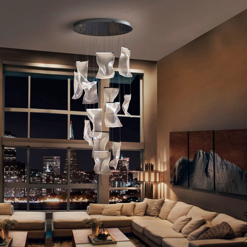 Como lámpara de 13 luces de gran formato, la Velos II requiere espacios amplios para lucir adecuadamente. Es ideal para techos de más de 2,7 metros de altura y estancias de más de 25 m² donde pueda apreciarse su diseño escultórico.