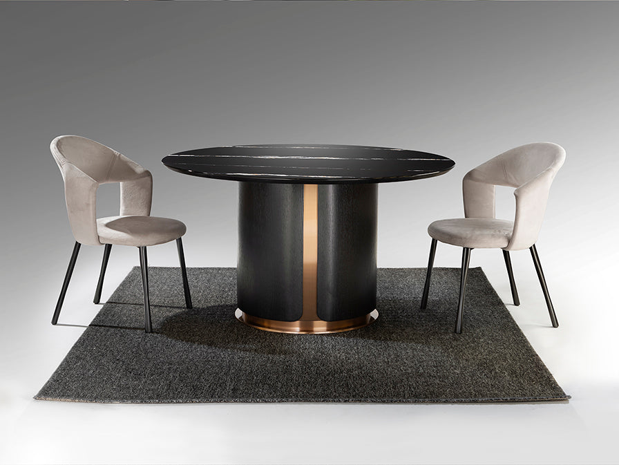 La mesa de comedor Zolo de Schuller es una pieza de mobiliario de alta gama que combina materiales nobles con un diseño contemporáneo sofisticado. Su configuración redonda con tapa de mármol negro veteado, base en DM chapado en roble oscuro y detalles en acero inoxidable oro rosa crean una pieza exclusiva que aporta elegancia y distinción a cualquier comedor.