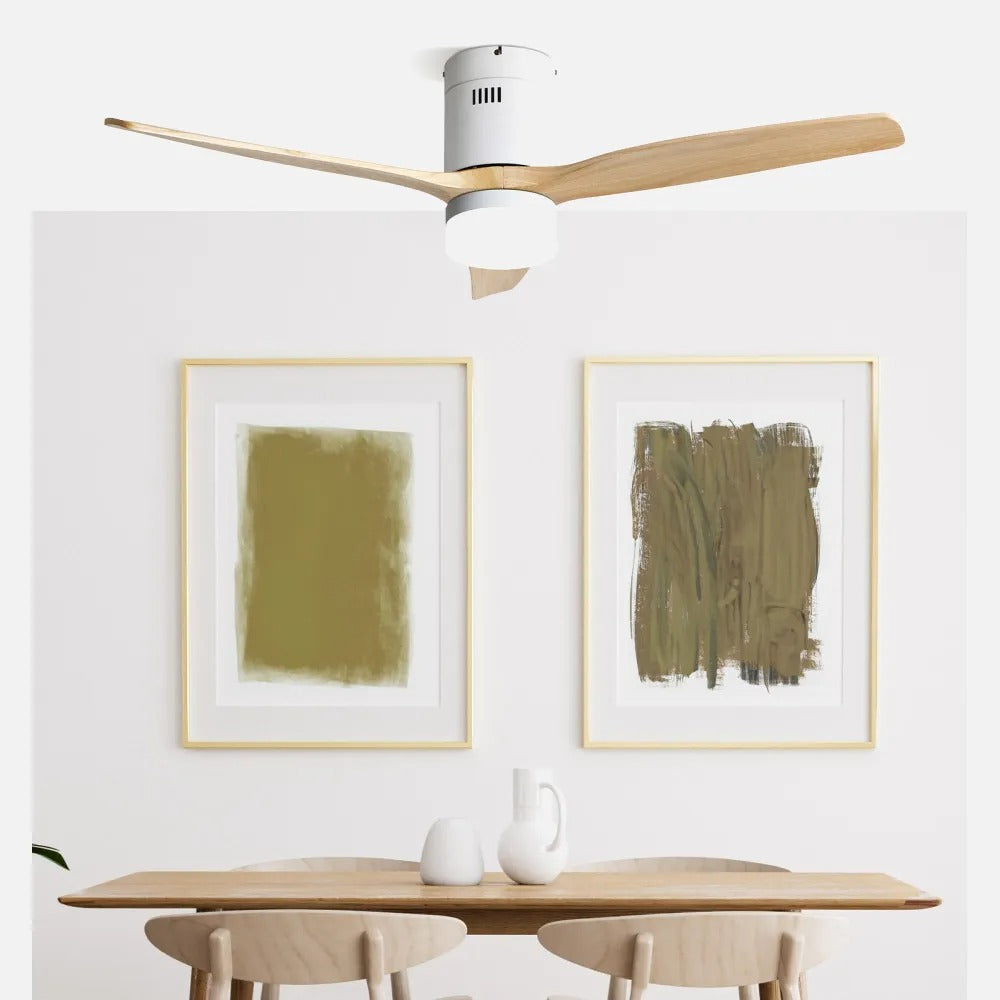 Ventilador de techo Aguilón de 132 cm con motor DC silencioso y 6 velocidades ajustables. Incluye luz LED integrada de 2450 lúmenes con tres temperaturas seleccionables (cálido, natural y frío) y función dimmable. Mando a distancia incluido. Aspas de madera con acabado blanco/haya. Función verano-invierno y temporizador hasta 2 horas. Eficiencia energética certificada. Ideal para espacios amplios.